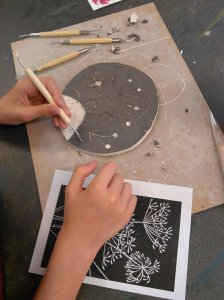 For Session 5 the pupils were introduced to a decoration technique called Sgraffito, where the coloured slip is removed to reveal the original clay underneath. Surprisingly the girls in the group were very cautious and nervous to start; on the other hand the boys got straight into it, resulting in amazing imagery…