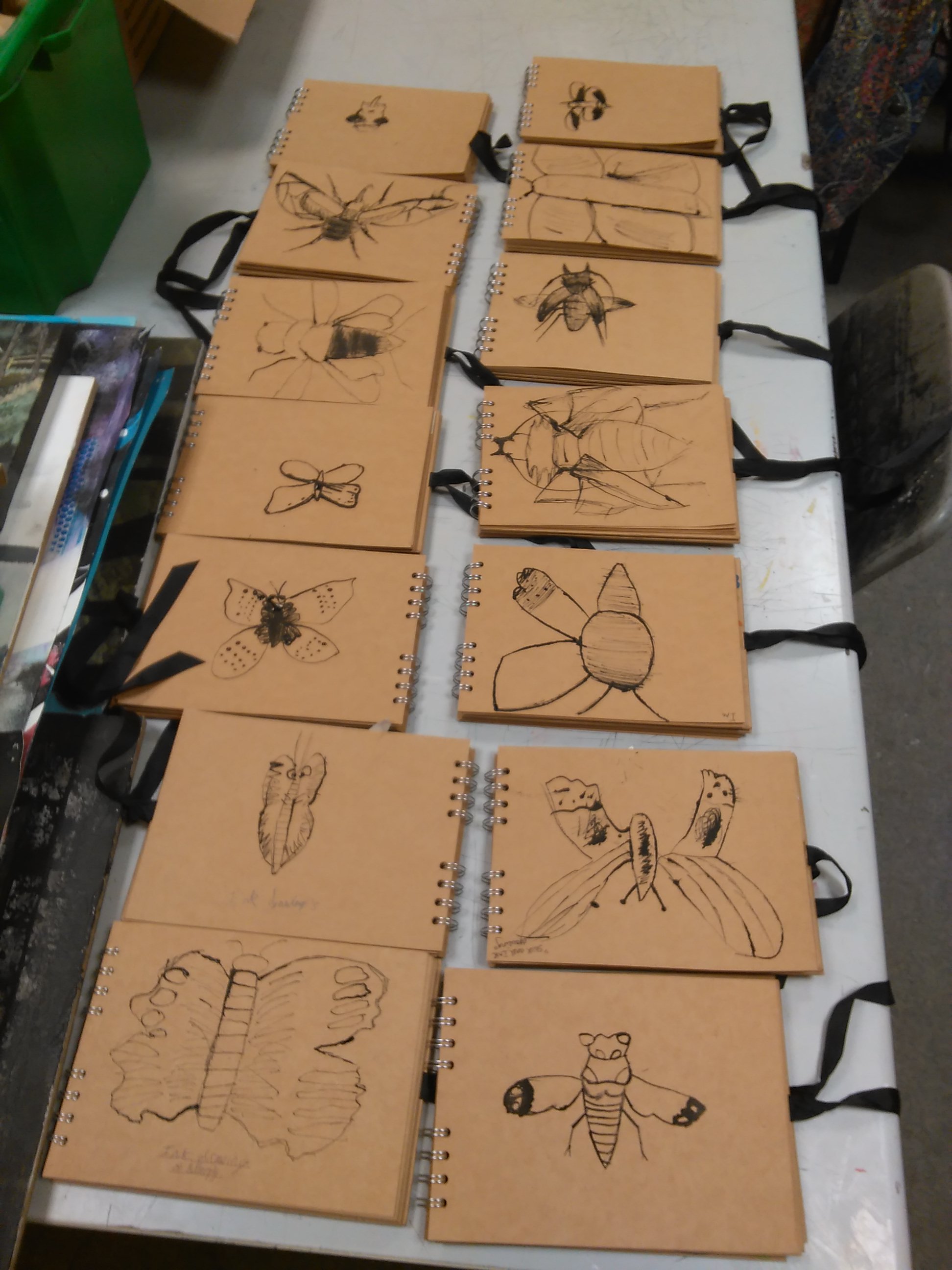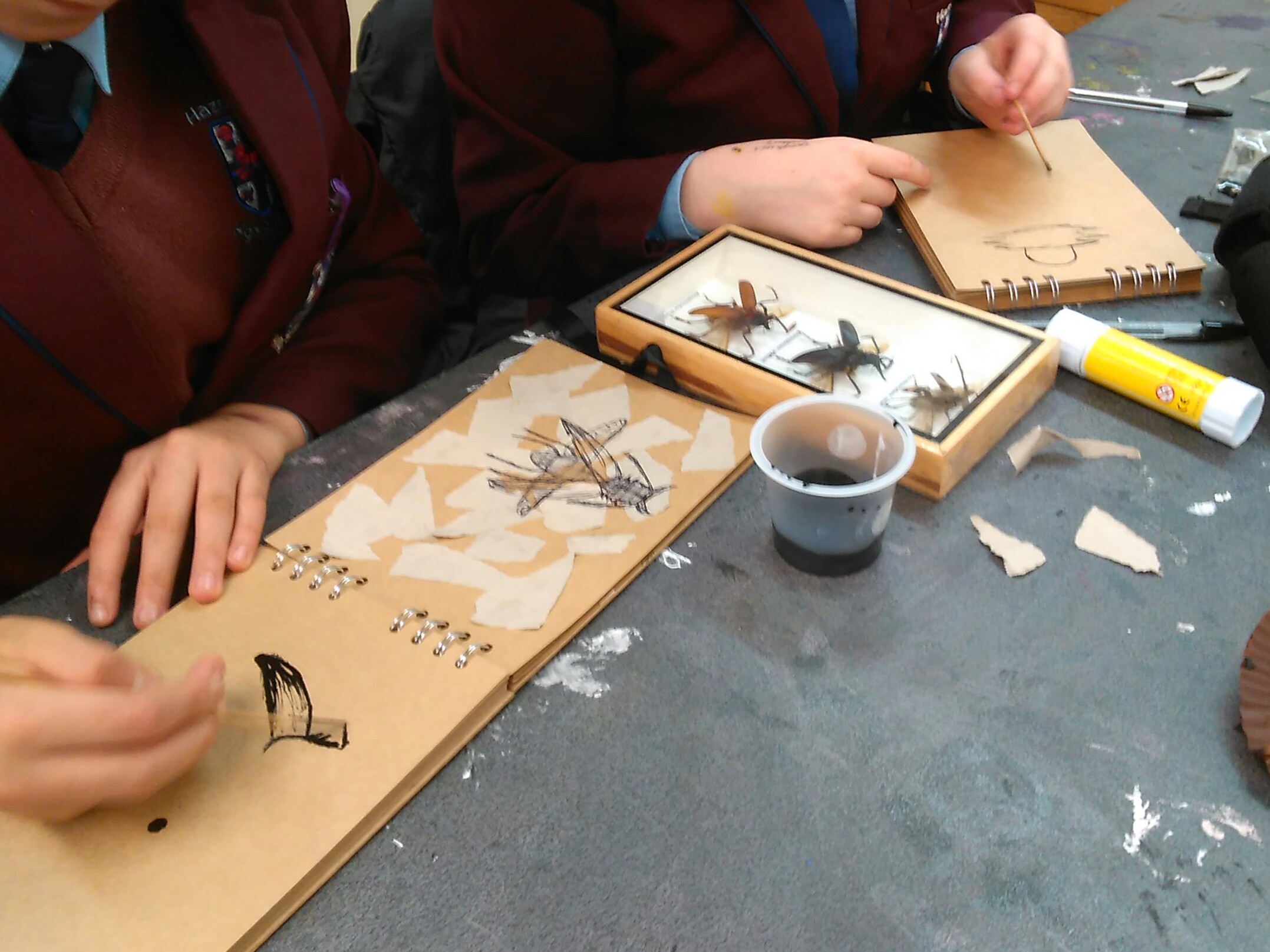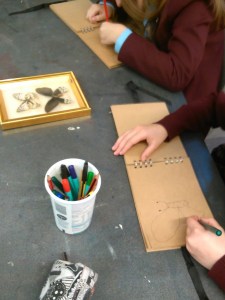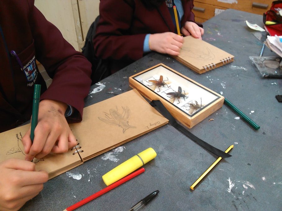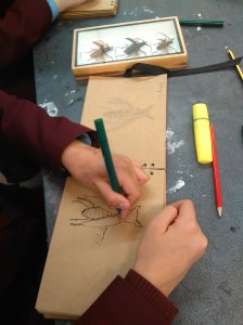 For the second Year 7 & 8 session, the pupils were introduced to experimental drawing techniques. Each pair of pupils were given an authentic specimen box containing beetles or butterflies, and were set with the following timed techniques: